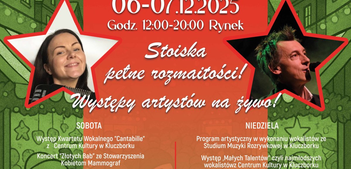 Już 6 i 7 grudnia w godz. 12.00 – 20.00 Rynek w Kluczborku wypełni się świąteczną atmosferą – pachnącymi choinkami, grzanym winem, pięknymi dekoracjami i wyjątkowymi stoiskami pełnymi rękodzieła oraz pyszności.